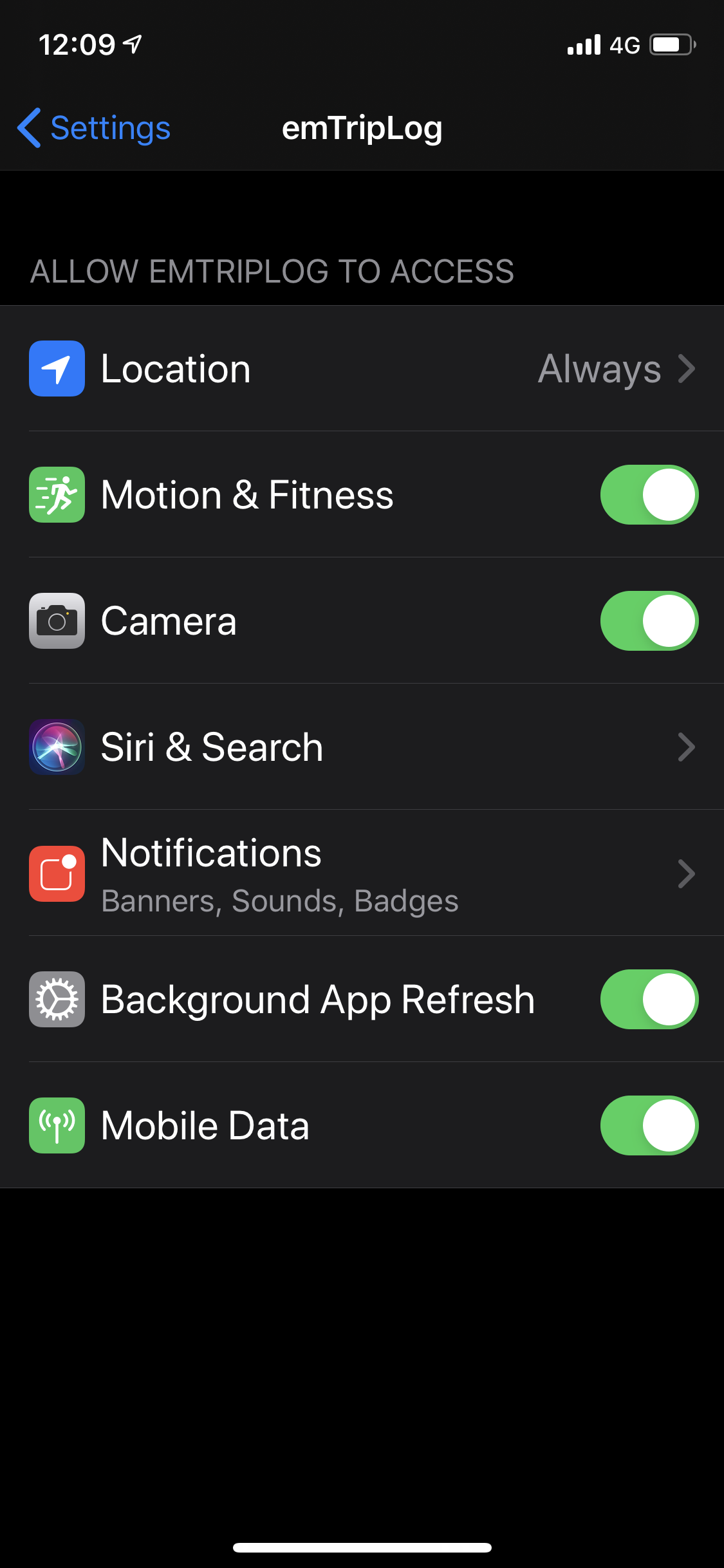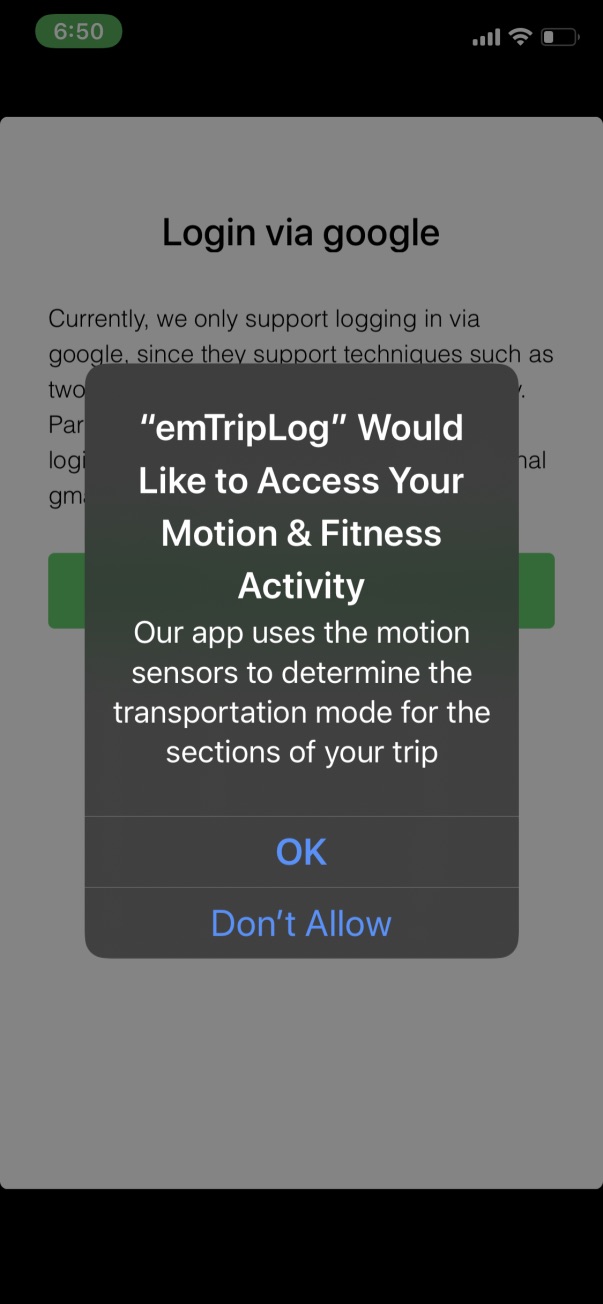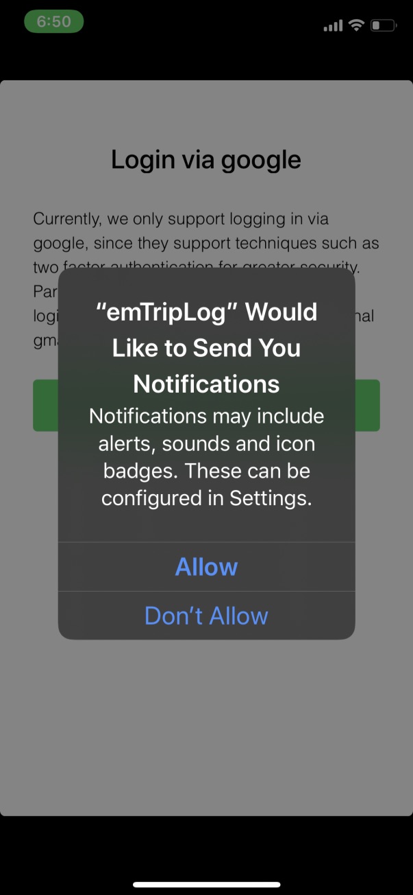 ❗ If you are using iOS 13 the ‘Always’ option in ‘Location’ will not be available in the pop-up, as shown below. You must go to your iPhone’s ‘Settings’ ➡ ‘Privacy’ ➡ ‘Location Services’ ➡ ‘emTripLog’ and choose the ‘Always’ option manually.